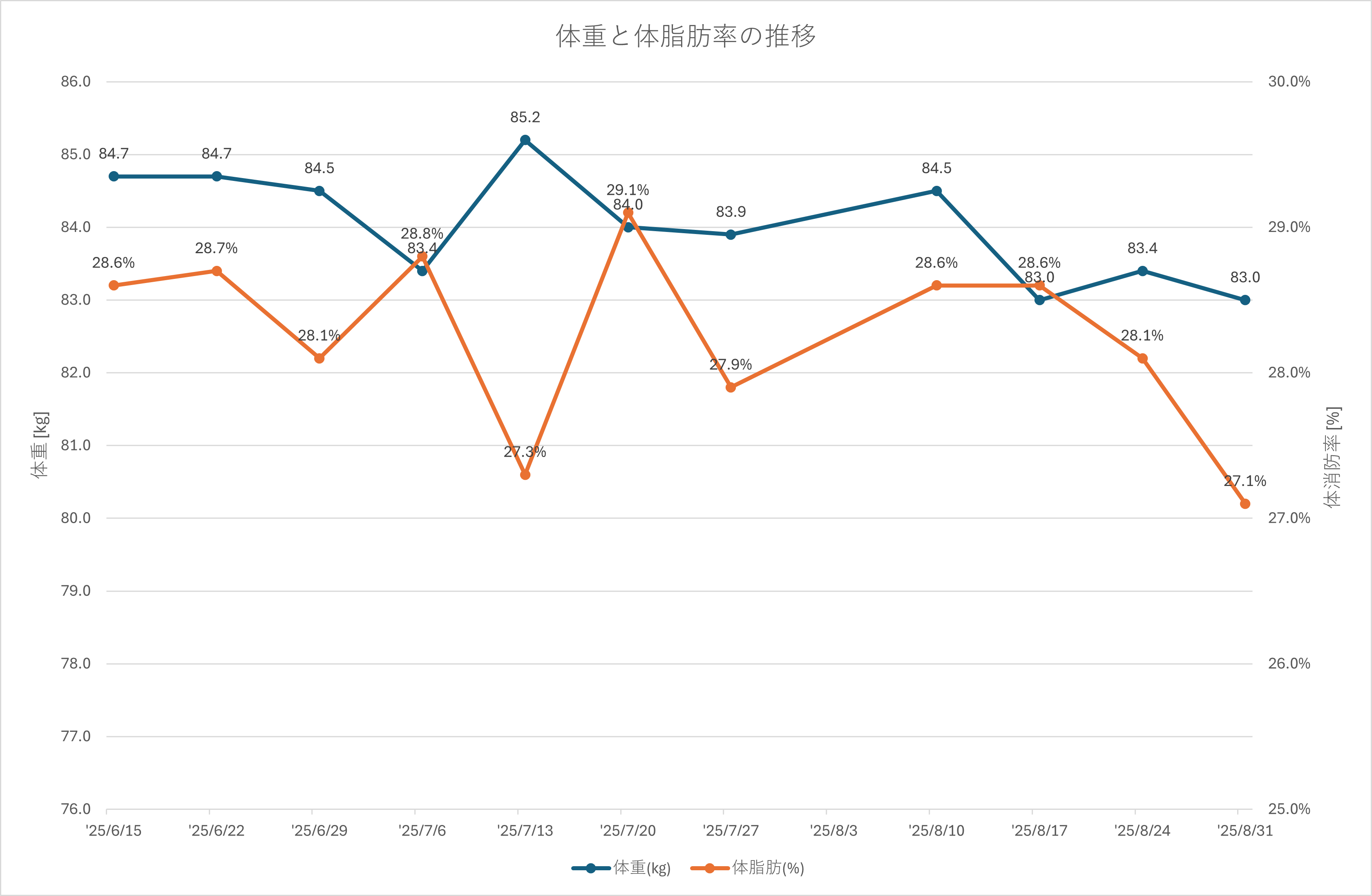 一時的に84.5kgまで戻る週もあり。食事や睡眠リズムに影響を受けやすい。