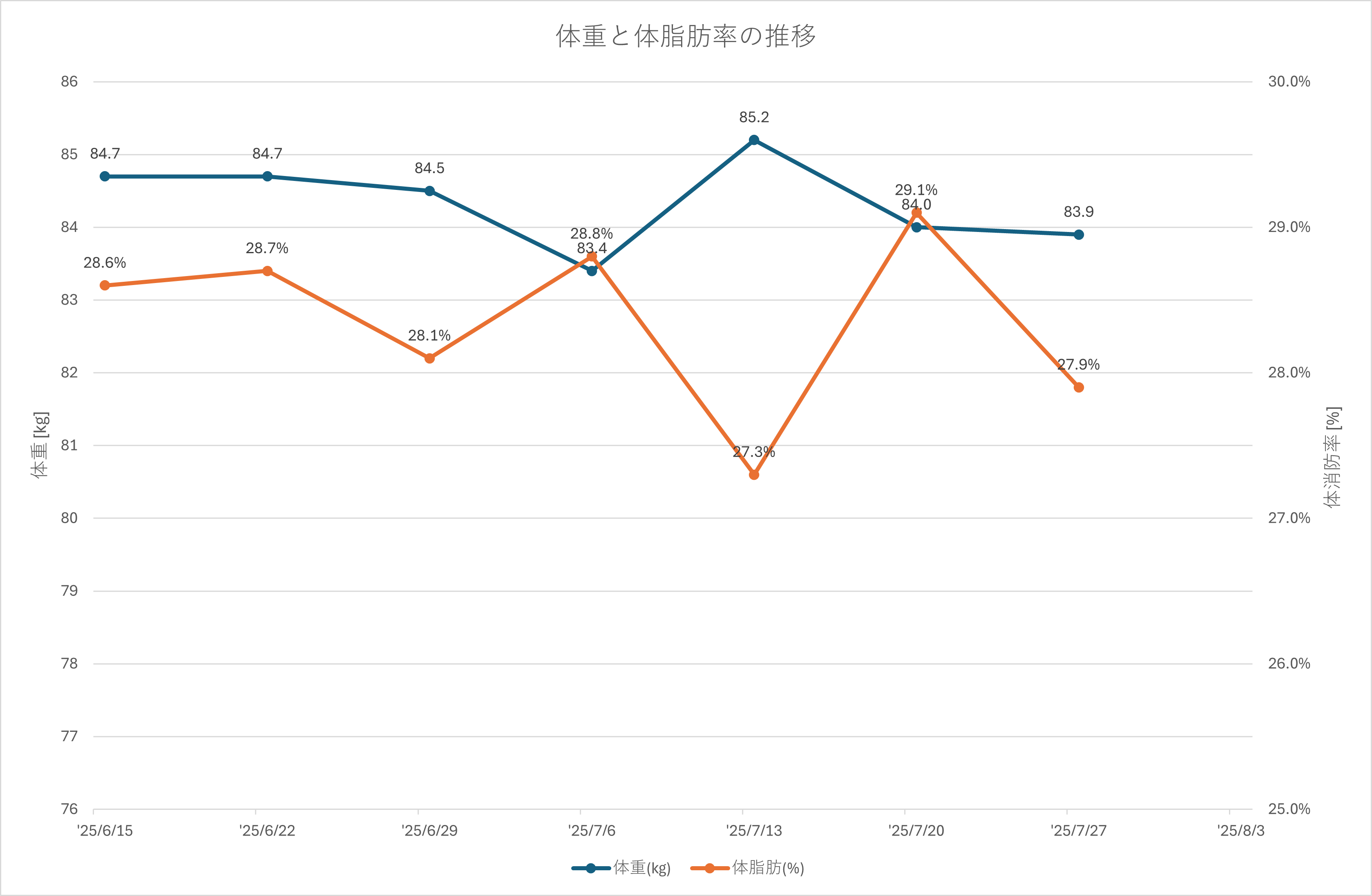 開始時の記録(84.0kg)と比較すると、-0.1kgとなっています。