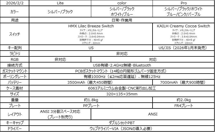 2026年1月末にProシリーズでJIS配列が追加されたものの、Lite / color系については引き続きUS配列が中心となっています。